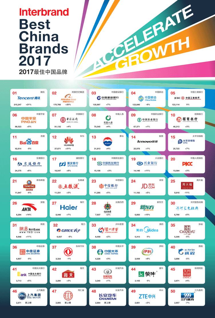 “2017最佳中国品牌价值排行榜”是Interbrand针对中国市场研究发布,采用经过第三方独立审计的财务资料以及广泛的消费者研究和市场资料,评出中国最具价值的品牌。榜单反映了品牌未来所贡献的经济利润,已成为中国企业品牌发展的风向标。